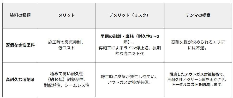 クリーンルームの床材選定において、環境対応の観点から安価な水性塗料(無溶剤系の一部を含む)が選択肢に挙がることもあります。しかし、安易な選択は、後に致命的なコスト増加を招くリスクがあります。